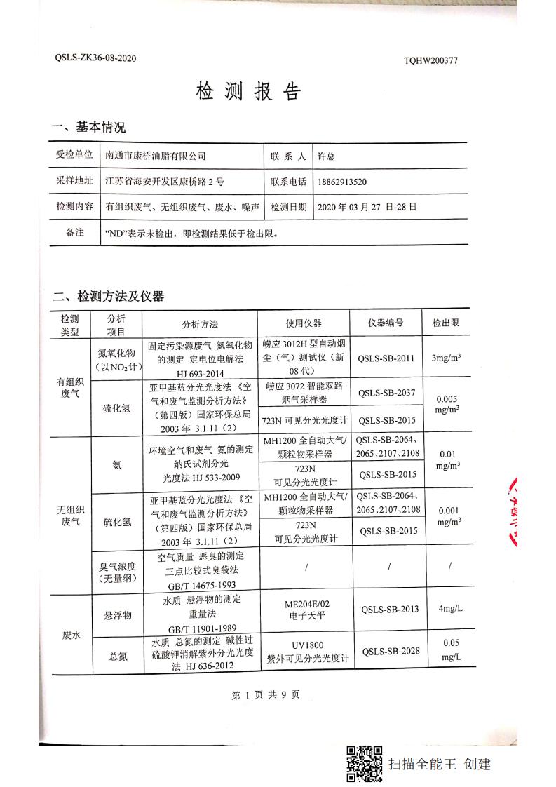 南通市康橋油脂有限公司3月份環(huán)境檢測報(bào)告