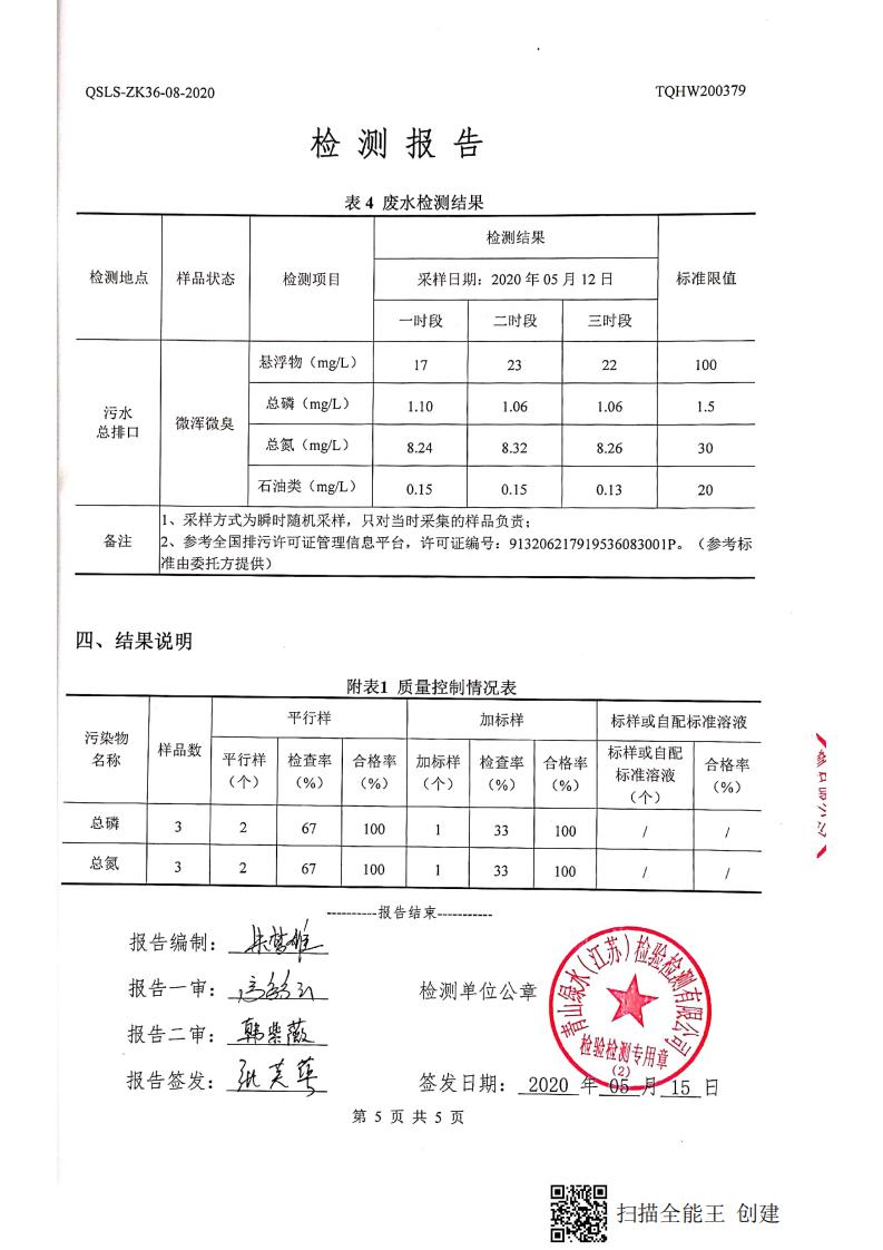 南通市康橋油脂有限公司5月份環(huán)境檢測報告