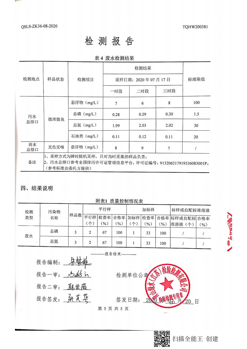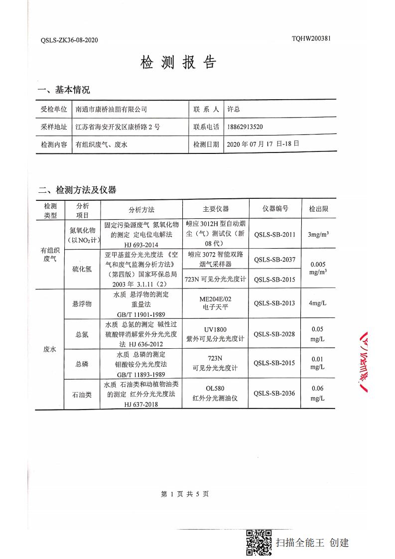 南通市康橋油脂有限公司7月份環(huán)境檢測報(bào)告